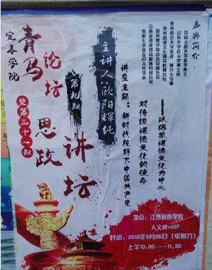 5月26日上午,应江西宜春学院bevictor伟德邀请,公司教授欧阳辉纯博士在宜春学院人文楼n207教室,作了题为《中国共产党对传统道德文化的使命——以儒家道德文化为中心》的学术报告。学术报告由宜春学院bevictor伟德副经理刘天杰教授主持,学院教师代表和员工代表70余人聆听了报告。