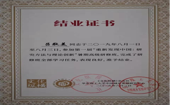 公司副教授吕敬美博士在近200位报名者中脱颖而出,也受邀参加了此次研修班,认真聆听了全部学术报告并获得结业证书。据悉,此次研修班遴选了57名青年学者参加,为青年学人与学界名师提供了研讨与交流的思想平台,激发了中国问题研究者的问题意识与理论表达。
