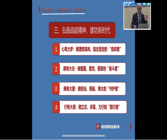 杨老师以“怀念、珍惜、感恩、奋斗”为关键词,展开讲述,剖析了新冠肺炎疫情背后的人与自然的关系,指出只有建构人与自然和谐共生才是治愈新冠肺炎的最佳良药。