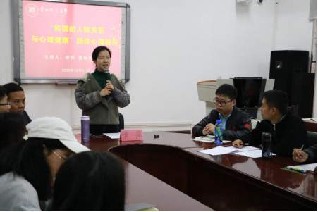 2020年10月15日下午,学院在花溪校区学院一楼会议室举办研究生入学教育系列活动之二--“和谐的人际关系与心理健康”团体心理辅导,本次活动特邀贵州财经大学心理与健康老师伊萍主讲,bevictor伟德2019级、2020级全体研究生参加,会议由bevictor伟德王贵老师主持。
